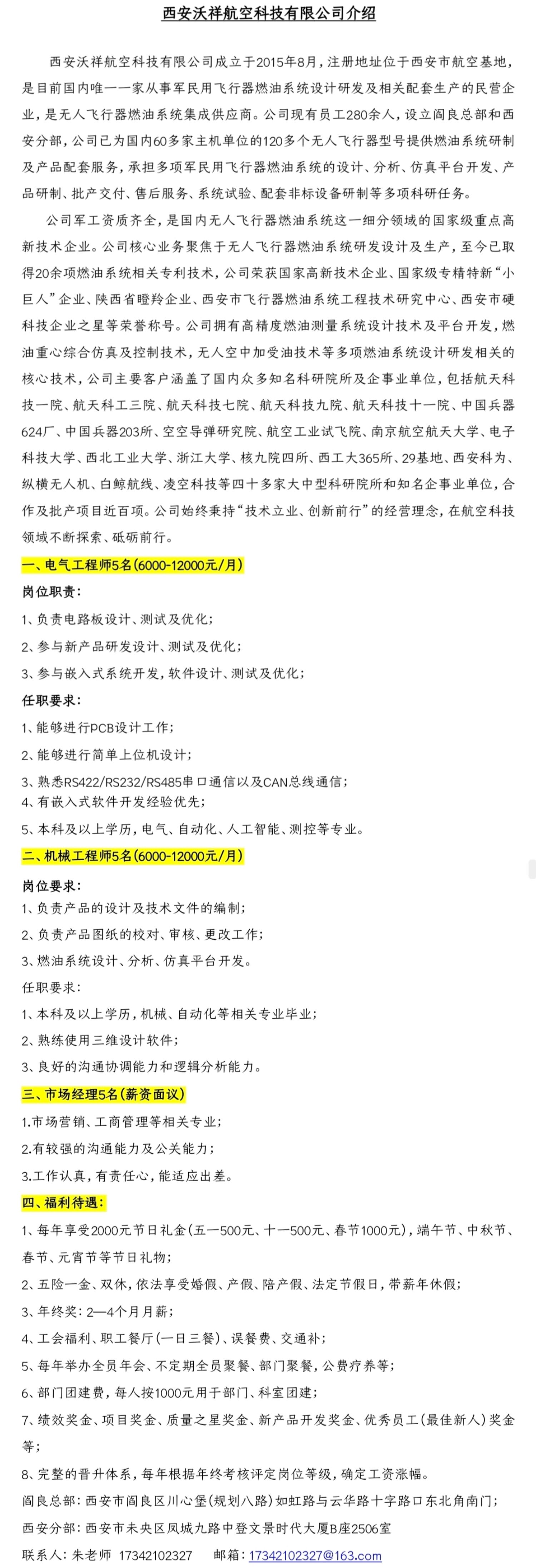 西安沃祥航空科技有限公司招聘简章