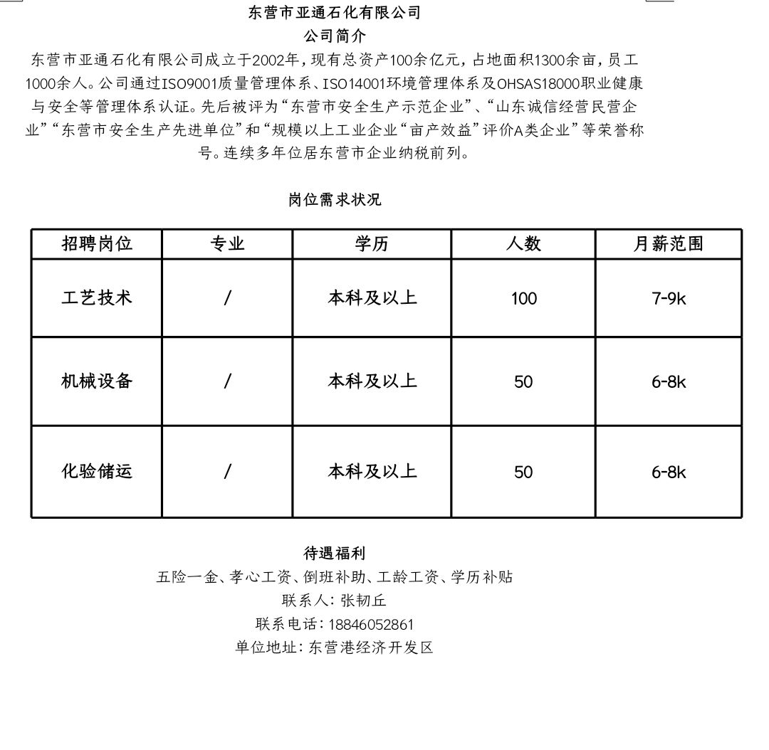 东营市亚通石化有限公司招聘简章