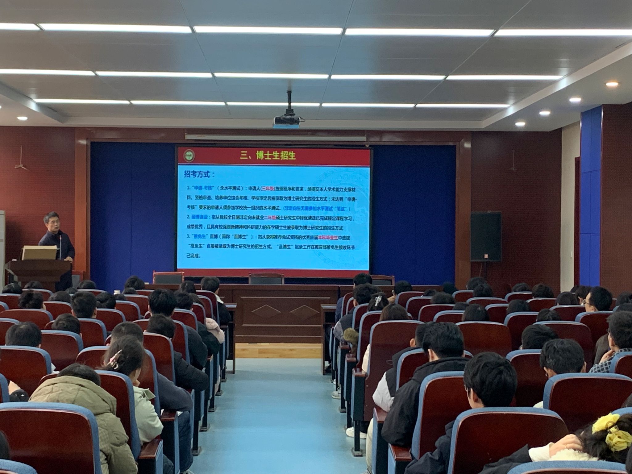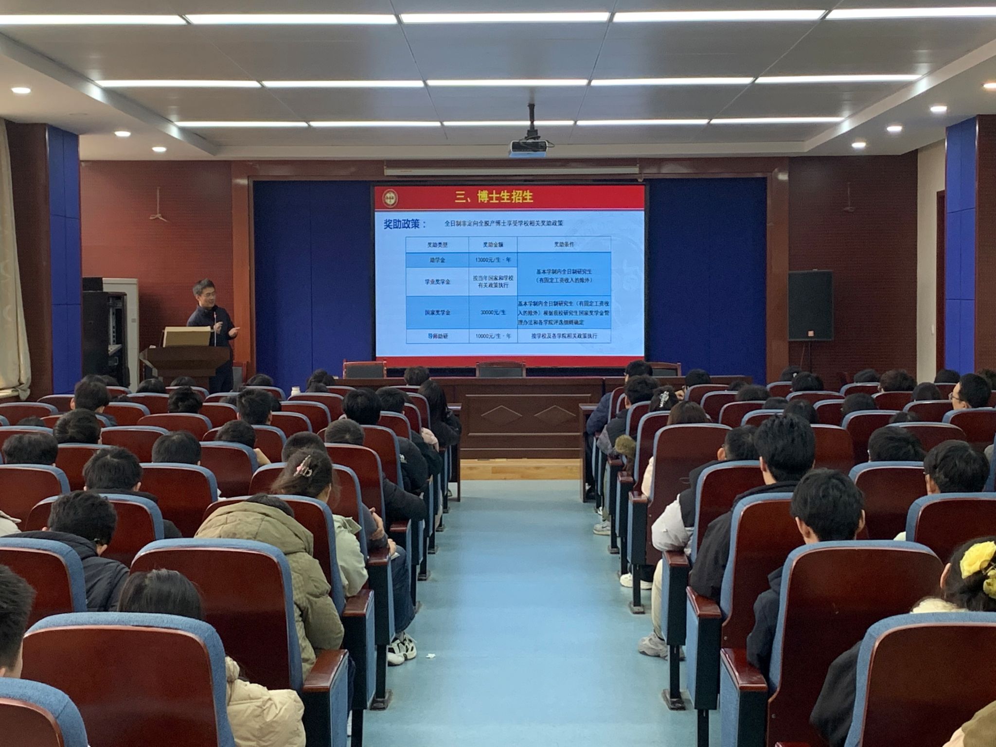 田院长就我院基本情况、博士研究生教育概况(学位点、师资、各类博士研究生招生政策、奖助体系等)和博士研究生教育的优势与特色进行详细介绍,鼓励大家积极同导师、研究生秘书沟通,通过多渠道了解更多信息。田院长的宣讲形式新颖、内容丰富、阐释精准,有很强的指导性和针对性,台下的同学们听得聚精会神,会上不时传来大家的掌声。