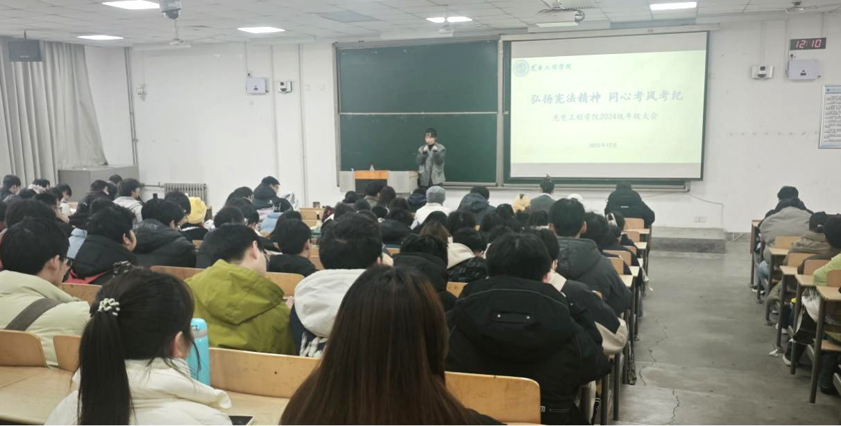 会上,蒋紫洮以“学宪法、守宪法、用宪法”为主题开展宣讲,向学生阐释宪法的重要意义与实践价值,引导学生树立宪法意识。随后,蒋紫洮详细解读了光电信息类省级以上重点学科竞赛项目,结合学院往届参赛获奖案例,鼓励学生组建跨班级、跨专业备赛团队,主动对接专业导师获取指导,充分利用学院实验实训资源,以竞赛为契机锤炼专业技能、培养创新思维。同时,对期末阶段的校园生活规划给予了建议,引导学生梳理各学科知识点,强调了保持规律作息和体育锻炼的重要性。最后,蒋紫洮带领全体学生学习了《伟德国际1946官方网学生考试违纪作弊处理办法》,树立“诚信考试光荣,违纪作弊可耻”的观念,鼓励学生相互监督、共同营造公平公正的考试环境。